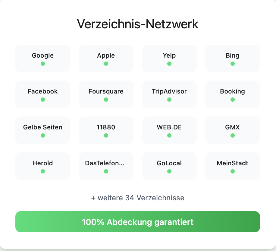 Stellen Sie sicher, dass Ihr Unternehmen in allen wichtigen lokalen Verzeichnissen präsent, aktuell und auffindbar ist. Unsere KI synchronisiert automatisch Ihre Daten in über 50 Plattformen.